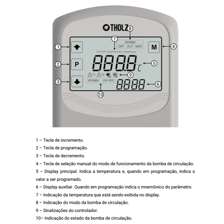 (sensiveis ao toque) onde são exibidos a temperatura da água e o estado da saída. O instrumento possui duas entradas para sensor de temperatura do tipo NTC, e uma saída de controle para o acionamento da bomba de circulação.
